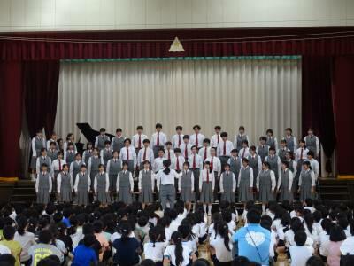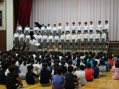 本日、本校の合唱団が、南小学校の昼の集会に参加し、小学生に歌声を披露しました。毎日の発声練習やもともと所属している部の紹介なども交え、「翼をください」「未来へつなげ」(小学校の音楽会で歌うそうです)を小学生と一緒に歌いました。小学校の先生方にも、成長した姿を見ていただくこともできました。