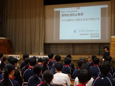 6校時に、薬物乱用防止教室を全校で実施しました。3年生は体育館で対面で、1,2年生は教室でリモートにて参加しました。講師は昨年に引き続き、国立精神・神経医療センター精神保健研究所薬物依存研究部科研費研究員の喜多村真紀様にお越しいただきました。市販薬の乱用で精神科を訪れる10代の若者が増える中、「ツラい気持ちには安全な方法で対処する」と題して、中学生ならだれでも感じるツラい気持ちや困りごとを相談できる人がそばにいないことで飲酒や薬物乱用、自傷行為などの危険な方法を選んでしまわないようなアドバイスをいただきました。