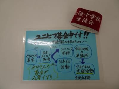 今日は、生徒会主催の朝会とユニセフ募金活動、あいさつ運動が行われました。朝会では、環境委員会が担当し、委員会の仕事内容やごみの分別などクイズも交え学校生活の向上を呼びかけました。本部役員は、ユニセフの募金活動、あいさつ運動を明日まで行っています。自分ができることを見つけて実行する姿勢が素晴らしいです。全校生徒に広がってほしいです。