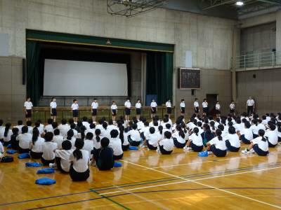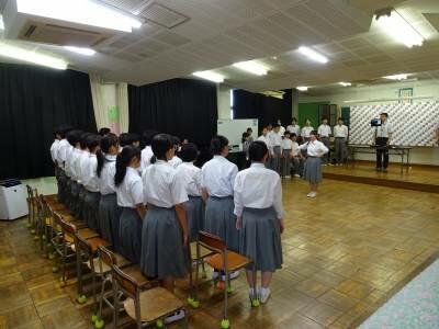 明日で1学期が終わります。今日は、3学年とも学年集会を開き、委員会の生徒を中心に1学期のまとめを行いました。