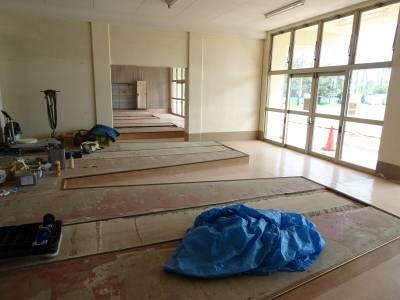 今日から8月。木質化工事が順調に進んでいます。特に、普通教室と昇降口は2学期初日から使用できるよう優先して工事を進めていただいています。教室は、棚等はすべて取り外し、床を研磨ました。床は表面を削ることで真新しい木目が表れ、木の良さを改めて感じることができます。昇降口も古い下足箱はすべて取り外しました。
