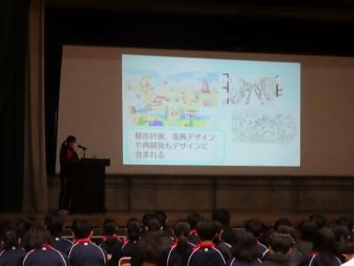 3年生の総合的な学習の発表の時間です。卒業研究ということで、これまで学んできたことをもとに、「よりよい社会を創る」という視点で各自で決めたテーマについて発表をしました。今日は、各クラスでの発表で代表に選ばれた生徒6名が学年全体の生徒の前で発表をしました。